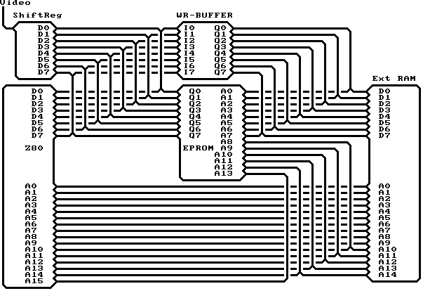 This page shows how it is possible to connect a SRAM and an EPROM in series for a Z80 processor system. It is intended for easy CRT systems. Contens of memory is unknown, and the code executes unknown look-up's in the EPROM.